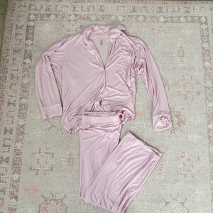 SKIMS women’s Cherry Blossom long sleeve pajama set featuring a relaxed, comfortable fit with a button-front top and matching elastic-waist pants. Made from SKIMS’ signature ultra-soft modal blend with stretch for all-day and night comfort. A beautiful, feminine lounge set perfect for sleeping, relaxing at home, or cozy mornings.