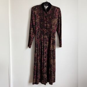 Beautiful dark romantic maxi dress in a color pallet of burgundy and gold with black velvet accented buttons and collar. Reminds me of old Victorian window drapes!