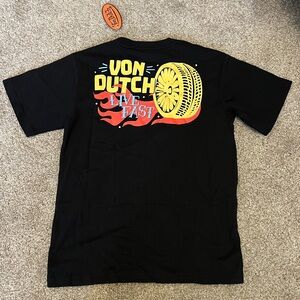 Von Dutch set featuring a black tee with yellow and red logo. Matching black pants with white logo detail. Casual and trendy.