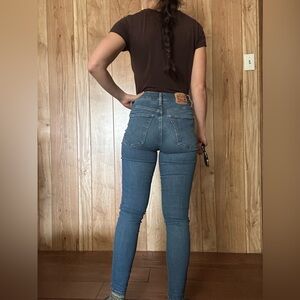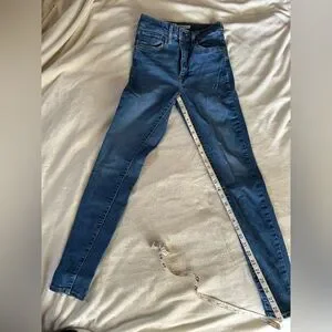 Super high rise and super skinny. Medium blue wash. Stretchy and comfortable. Great condition, no signs of wear other than the Levi’s tag on the back. For size comparison I am 5’3” and 125lbs.