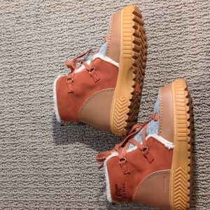 This is a Sorel Ona Ave Alpine Waterproof Boot in a tan and orange colorway with a faux shearling/felt trim. Warm boots with fur lining. Features orange accents and gray body. Ideal for winter wear.