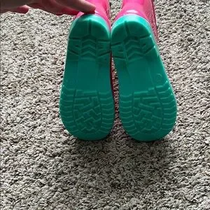 Bright pink rain boots with teal handles and soles. Perfect for rainy days.