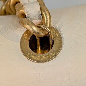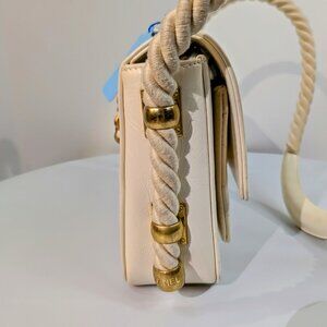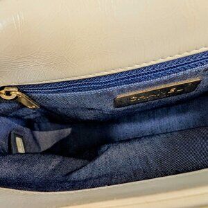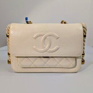 This Chanel very rare and distinctive flap bag is from the Cruise 19 collection; in fact, an identical bag was carried on the runway that year. The bag is meticulously crafted from supple crumpled calfskin providing a unique texture to the light cream/white exterior. Its classic flap silhouette is enhanced by an unconventional and eye-catching rope shoulder strap, secured by elegant, brushed gold C-rings that bear Chanel branding and add a nautical-inspired touch. A wide brushed-gold chain, threaded with white leather serves as a top handle. The front flap is adorned with an embossed CC logo, and it opens with a push lock to a wide quilted slip pocket. There is also an exterior quilted slip pocket in the back.