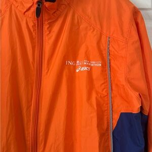 Excellent condition. Windbreaker from the NYC Marathon. Bold orange and navy design. Lightweight and breathable. Ideal for outdoor activities.