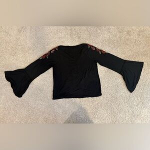 American Eagle “soft and sexy” faux wrap style blouse. Featuring bell sleeves, flower embroidery, and a criss cross neckline.