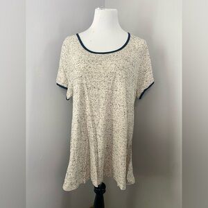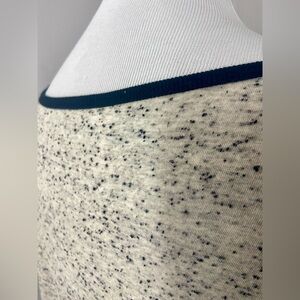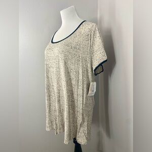 Featuring short sleeves, a high neckline, and slightly more length in the back for a flattering fit, the Classic T truly is a staple in everyone’s closet! This piece is new with tags and made of a jersey-poly blend. It is a heathered/speckled black and white style with black trim on the sleeves and neckline. Size 2XL.