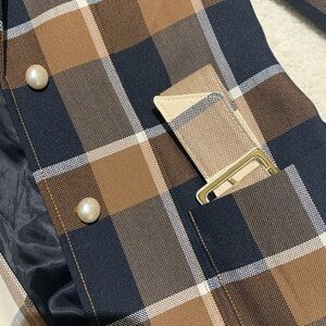 Chic plaid blazer with a classic design. Features a mix of brown, cream, and black. Ideal for a sophisticated look.