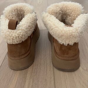 Cozy UGG boots with chestnut suede. Plush shearling collar. Perfect for chilly days.
