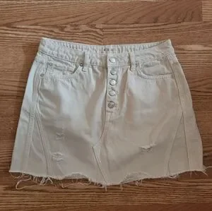 Stylish beige denim skirt with button-up front. Features distressed details and frayed hem.