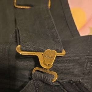 Durable black overalls with a distinctive logo patch. Features adjustable straps and practical pockets.