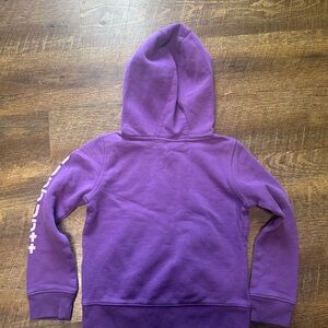 Purple Carhartt hoodie. Features a hood and front pocket. Perfect for everyday wear. Could have discoloration. Don’t see any visible stains.