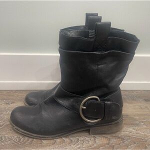Stylish black leather boots featuring a large buckle detail. Perfect for a chic look.