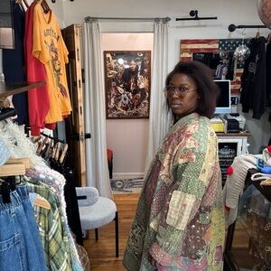 Made to fit ONE SIZE FITS MOST...oversized and lightweight quilted kimono. Patchwork and applique of flowers and words throughout; with a little classic MP splatter paint throughout. Yrsa can be worn inside out and will showcase the words "LOVE LIKE THIS"