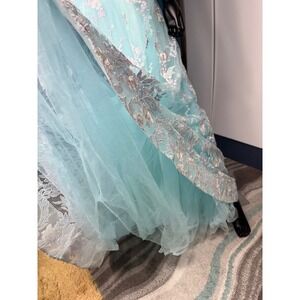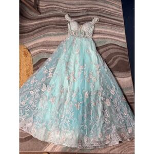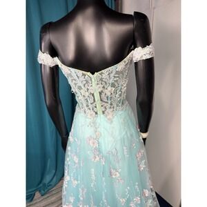 Morrell Maxie Size 4 Aqua White Floral Lace Off Shoulder Formal Gown