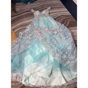 Enchanting elegance unfolds in this Morrell Maxie gown, a vision in aqua and white. Embroidered floral lace cascades gracefully, creating a dreamy aesthetic. The off-the-shoulder neckline accentuates the décolletage, while the fitted bodice provides a flattering silhouette. Delicate details and impeccable construction exude luxury and sophistication. An ideal choice for prom, a gala, or any special occasion where making a lasting impression is paramount.