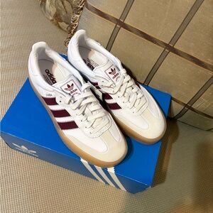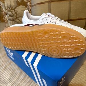 Classic Adidas Samba sneakers in white with bold burgundy stripes. Gum sole adds a retro touch. Ideal for casual wear.