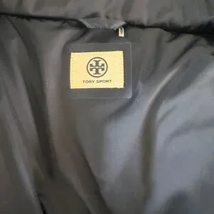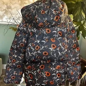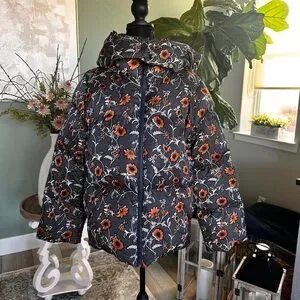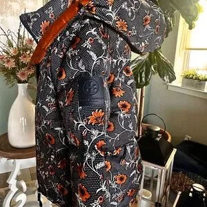 Sleek, gorgeous puffer jacket by Tory Sport. Navy blue/orange flower accents. Ideal for a chic, modern look. Brand new. Snap-on, removable hood. Never worn. Smoke & pet free home.