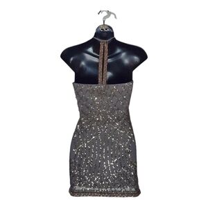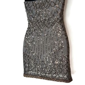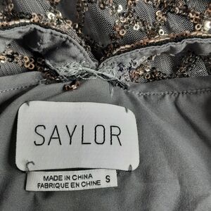 Elegant mini dress by SAYLOR. Features intricate bronze-gold sequins and beads detailing on a lined, sheer gray base.