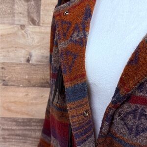 Vintage Woolrich trench coat with a striking red and brown pattern. Features toggle closures and a warm hood. Ideal for stylish layering.