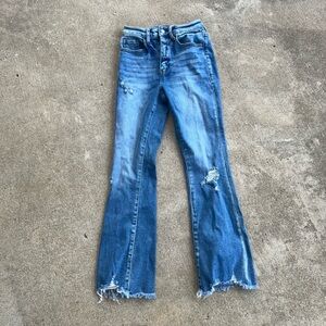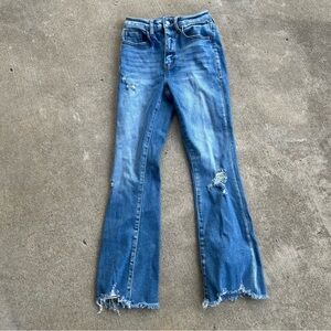 Stylish distressed flare jeans in a classic blue shade. Perfect for a casual yet chic look.