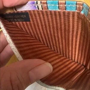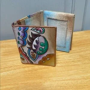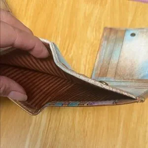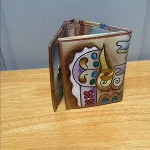wallet with artistic patterns. Features purple, green, and tan hues.
