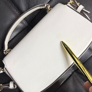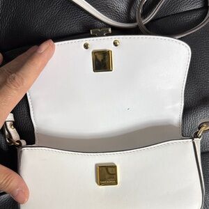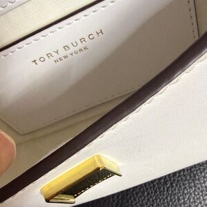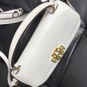 Chic Tory Burch crossbody bag in white leather. Features iconic gold logo. Perfect for stylish outings. Minimal signs of superficial scratches and stain from storage (needs a little cleaning on the spots I pointed out. I didn’t want to ruin it) Strong magnetic closure, adjustable/removable strap. She’s a cutie 🥰