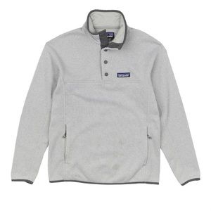 Cozy gray sweater with button-up collar. Features Patagonia logo. Perfect for layering.