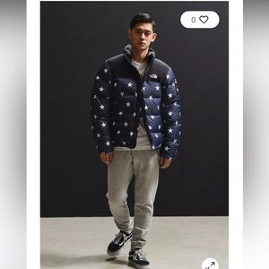 The North Face International Collection Nuptse Jacket featuring a black background with white stars is indeed a rare and distinctive piece. This design was part of The North Face’s 2017 International Collection, which celebrated global cultures through limited-edition releases. The black and white stars pattern, along with the American flag patch on the sleeve, made this jacket a standout item among collectors and fashion enthusiasts. First three stock photos is black the others are