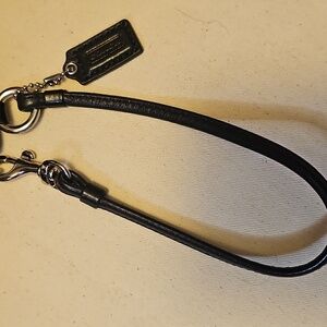 Elegant black wristlet with signature Coach emblem. Features silver hardware and detachable strap. Size 4 1/2 X 4