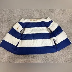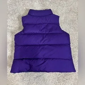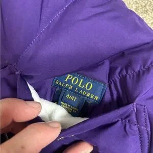 Ralph Lauren County Riders & Jockey Club Girls Reversible Puffy Vest Purple 4T. Preowned condition. Some untreated white marks on the purple side and some staining near the neckline of the white side. May come out in the wash. Lots of life left. Reversible. Down puffer. Pockets on both sides.