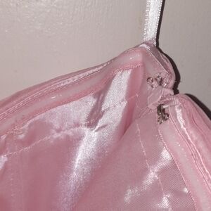 Strapless allover ruching fashioned from pale pink chiffon for subtle shimmer. Fully lined in satin, with padded cups, light boning to hold shape, and rubber gripper in bodice. Side zip with hook & eye closures.
