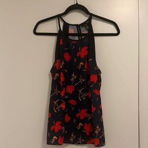 Stylish sleeveless top with a vibrant red floral pattern on a navy background. Perfect to dress up or down! Features top button back closure
