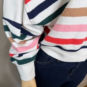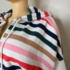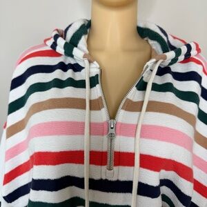 A soft and cozy Aerie half-zip hoodie with a relaxed, slouchy fit and colorful horizontal stripes. Designed with a comfortable terry-like knit texture, a functional half zipper, drawstring hood, and ribbed cuffs/hem. Easy to pair with leggings or denim for an effortless lounge or casual look.