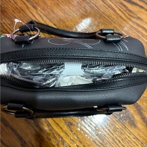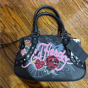 Chic Ed Hardy satchel in black with striking pink and red details. Features bold graphic design. Ideal for a trendy look.