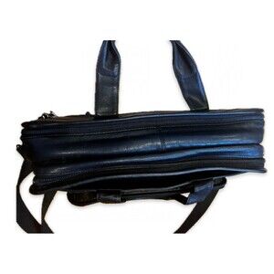 THE DETAILS Crafted from rich black leather with durable metal hardware. It features a dedicated luggage pass-through sleeve for travel and includes a detachable, adjustable shoulder strap for commuter convenience. Multiple organizational compartments provide ample space for tech and documents. Dimensions: 14.8in x 11.9in x 3.7in.