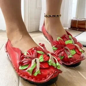 Socofy Red Flower Handcrafted Leather Slip On Loafers Shoes 9.5