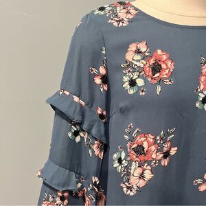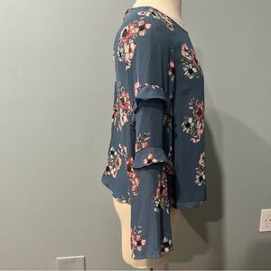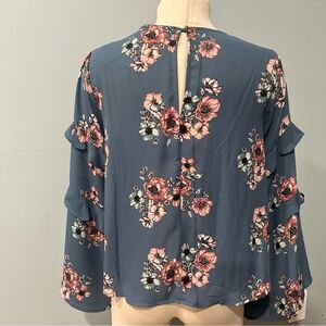 NWT Lush Ruffle Bell Sleeve Blouse in Dusty Blue Blush/Ivory Floral Size Small