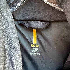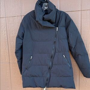 Stylish black puffer jacket featuring an asymmetrical zipper. Perfect for cold weather.