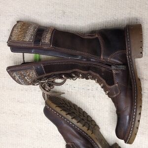 Brown leather and suede with some signs of wear. high quality boots with tons of life left.
