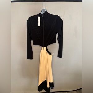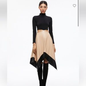 An alluring midi dress, meet Tamika. She includes a vegan leather skirt, side cut-outs, long sleeves and an asymmetric hem. She gives the effect of two pieces in one, but no styling tricks are needed.