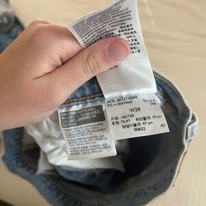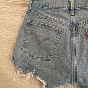 These Levi's blue jean shorts feature a trendy distressed cut-off style with frayed hem edges, offering a vintage, worn-in look. The classic blue color and raw, unfinished edges make them a versatile addition to any casual wardrobe.