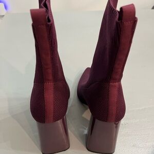 Stylish maroon knit ankle booties. Sleek design with a modern touch. Ideal for versatile wear.