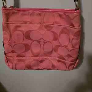 Add a pop of color to your outfit with this elegant pink crossbody bag. Perfect for daily use, it offers both style and convenience. Monogram print. Gently used and comes with matching change zipper pouch.Adjustable strap.