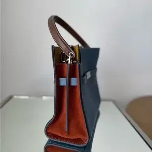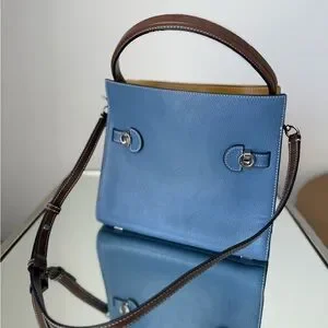 Elegant blue satchel with brown accents. Stylish and versatile. Perfect for any occasion.