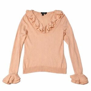 Lauren Ralph Lauren Silk Cashmere Ruffle Neck Ruffle Cuff Pink Sweater Size Petite Medium P/M. Green label. Natural fiber material: 86% silk 14% cashmere. Very good used condition.