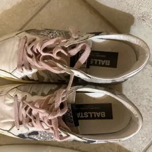 Stylish Golden Goose sneakers. Camouflage pattern with glitter star. Pink laces. Comfortable and trendy.