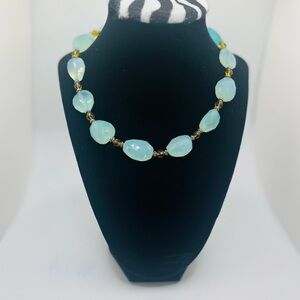 Beautiful artisan-style necklace made with faceted aqua tourmaline natural stone beads. The stones have a soft, glowing translucence with natural variations that give them that dreamy sea-glass look — even prettier in person.