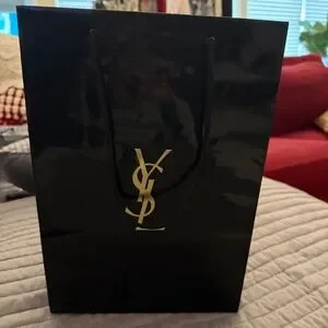 PITCH BLACK, INITIALS IN REFLECTIVE GOLD BRANDED LOGO. SATIN CARRY STRAPS. UNUSED, NOT SPINDLED, FOLDED (EXCEPT WHERE IT'S SUPPOSED TO BE FOLDED) OR MUTILATED. PUT THOSE GIFTS IN A COOL BAG. HER FRIENDS WILL BE EATEN UP WITH ENVY.