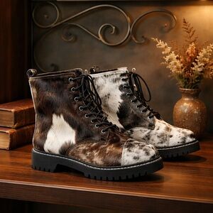 A grungy punk cowgirl rugged look which will get you through snowy weather with ease. It is made from natural black and white cowhide leather, so be assured of its resilience.