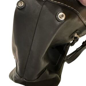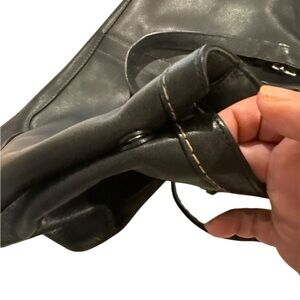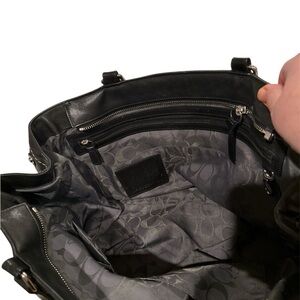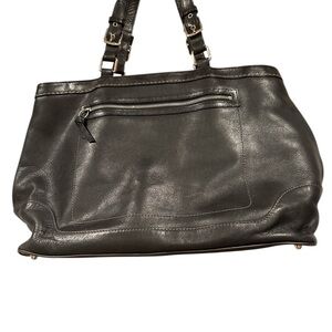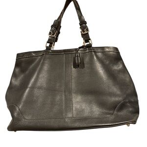Sophisticated Coach tote in black leather. Features sturdy handles and sleek design. Perfect for everyday use. The bag is made of black leather with contrast stitching and features silver-tone hardware and adjustable double handles with buckle details.